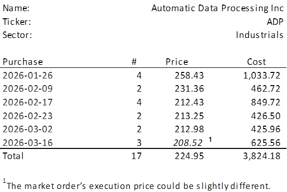 The lowest amount belongs to ADP. We will acquire 3 shares of ADP on Monday morning. See the post from 2026-02-08 for a more in-depth look at ADP. Below, is the purchase history and average cost calculation.