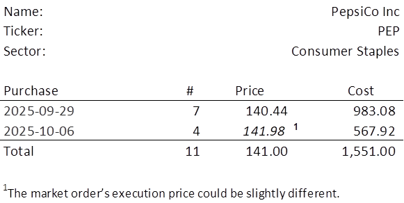 The lowest amount belongs to PEP and we’re sittin’ pretty all together in Schaefer City, because the existing position imbalance is such that there are only three positions eligible for additional investment at this time and PEP is one of them (the other two being FRT and UHT). Additionally, we have $296.01 of uninvested income that we can deploy. Therefore, I will purchase 4 shares of PEP on Monday. Below, is the purchase history and average cost calculation.