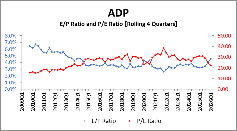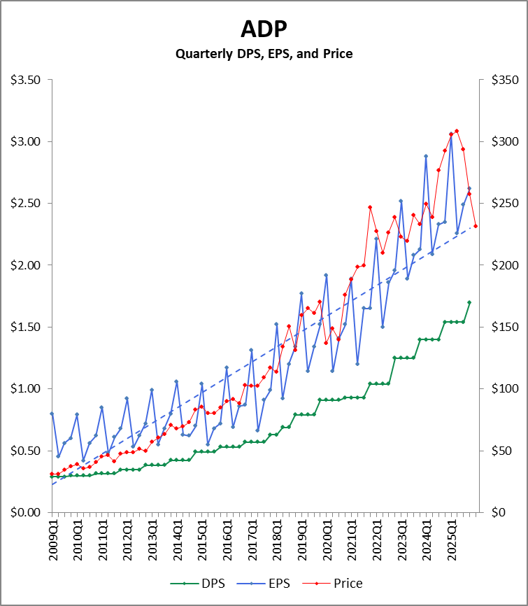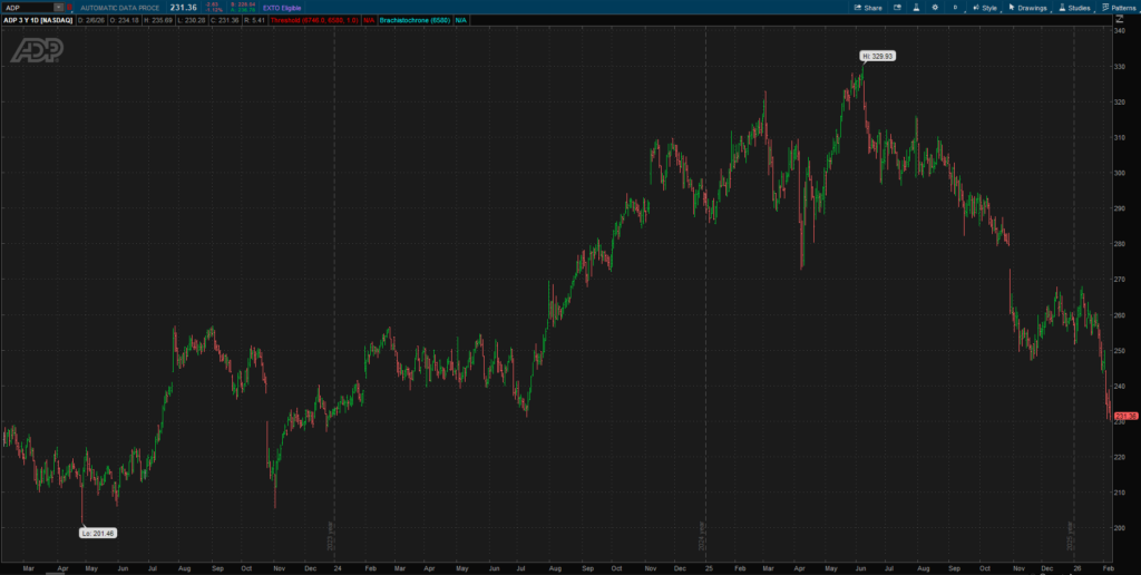 ADP dropped from an all-time high of $329.93 on 2025-06-06 to $231.36 on 2026-02-06. Shedding 30% in eight months is surprising for a company whose earnings are climbing steadily.