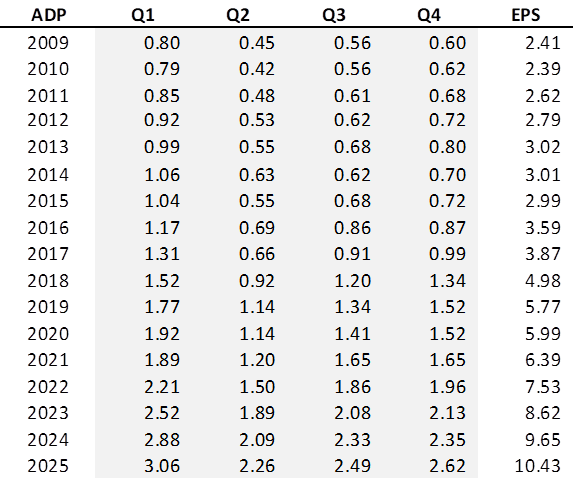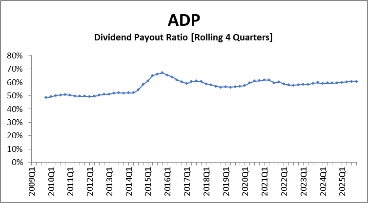 ADP is a Dividend King, with an impressive 51-year streak of annual dividend increases. The company’s dividend payout ratio has been steadily trending higher. Ordinarily, a rising payout ratio relative to earnings per share (EPS) could raise concerns about the sustainability of future dividend growth. Yet, ADP’s earnings are remarkably consistent from quarter to quarter, allowing the company to comfortably support a higher payout ratio. Furthermore, the payout ratio is still at a comfortable 61%.