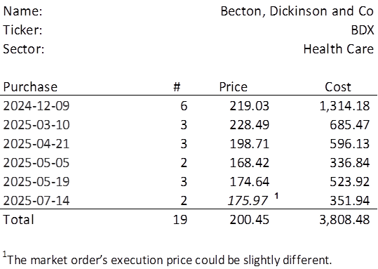 The lowest amount belongs to BDX which last traded at $175.97. Therefore, I will acquire 2 shares on Monday. See the post from 2025-05-03 for a more in-depth look at BDX. Below, is the purchase history and average cost calculation.