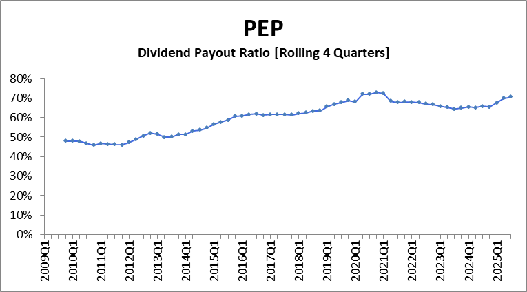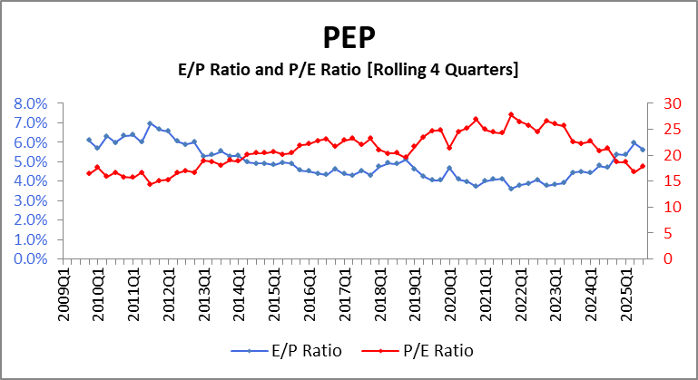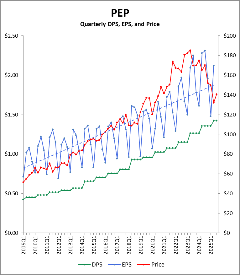It’s funny that not too long ago EPS over the first half of the year of $3.59 was enough to juice the stock price within spitting distance of $200, but now it isn’t enough to warrant $145. The P/E ratio of 17.84 is at the lower end of the range of where PEP has traded over the last 16 years.