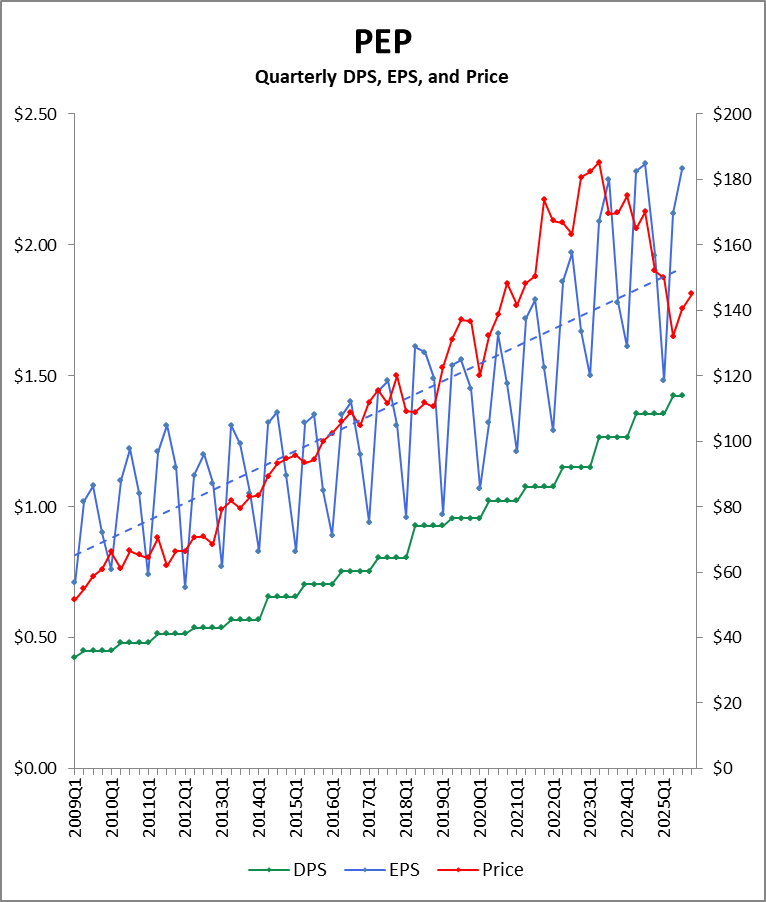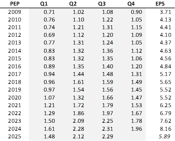 PEP announced quarterly earnings on 2025-10-09, just three days after we last added shares. Let’s see how this recent performance falls into the context of the last 16+ years.