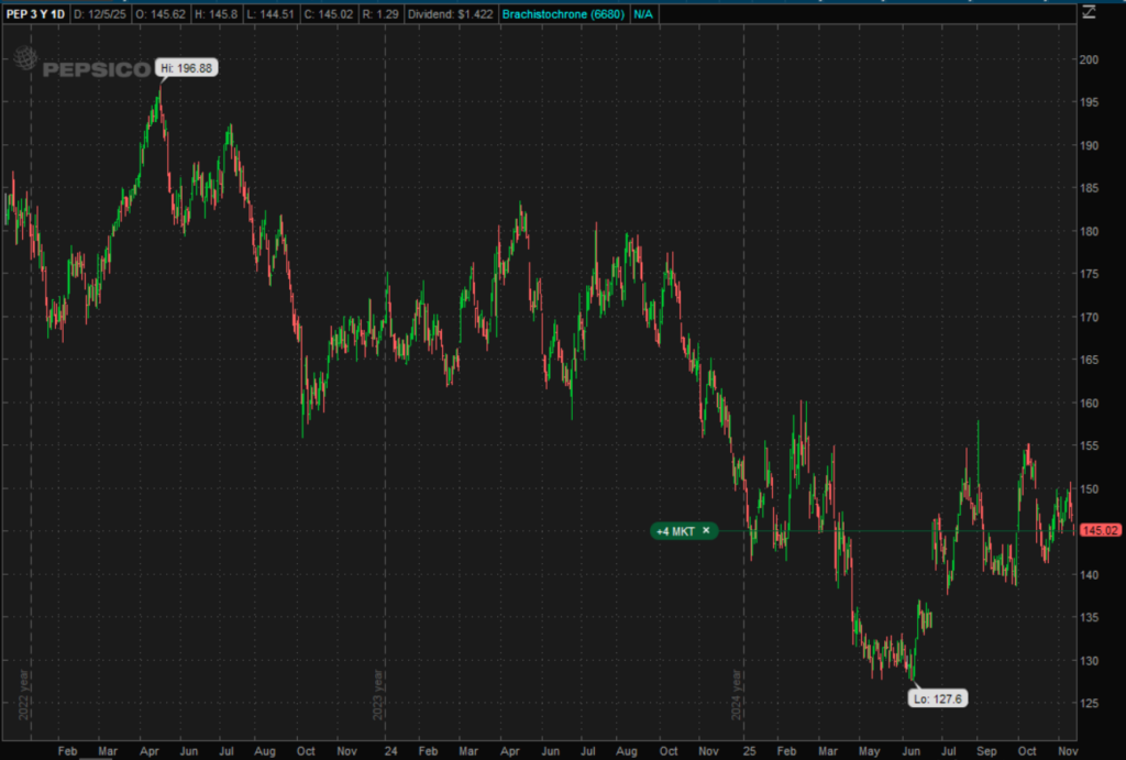 PEP dropped from an all-time high of $196.88 on 2023-05-15 to $127.60 on 2025-06-26. Losing 35% in just over two years is concerning, but the stock price appears to have stabilized now.