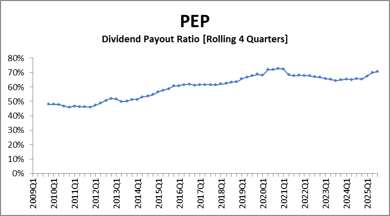 PEP is a Dividend King, with an impressive 53-year streak of annual dividend increases. Alongside this growth, however, the company’s dividend payout ratio has also been trending higher. Ordinarily, a rising payout ratio relative to earnings per share (EPS) could raise concerns about the sustainability of future dividend growth. Yet, PEP’s earnings are remarkably consistent from quarter to quarter, allowing the company to comfortably support a higher payout ratio. The rarity of earnings disappointments reinforces the company’s ability to maintain dividend safety.