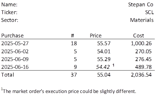 There is an additional $251.74 in uninvested income available this week. The lowest amount belongs to SCL which last traded at $54.42. Therefore, I will acquire 9 shares on Monday. See the post from 2025-05-25 for a more in-depth look at SCL. Below, is the purchase history and average cost calculation.