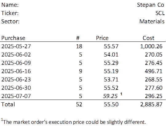 The lowest amount belongs to SCL which last traded at $59.25. Therefore, I will acquire 5 shares on Monday. See the post from 2025-05-25 for a more in-depth look at SCL. Below, is the purchase history and average cost calculation.