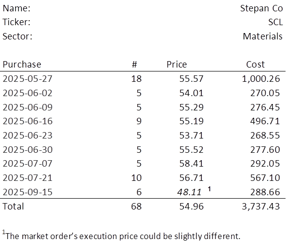 The lowest amount belongs to SCL which last traded at $48.11. Therefore, I will acquire 6 shares on Monday. Below, is the purchase history and average cost calculation.