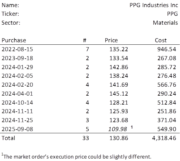 There is an additional $321.00 in uninvested income available this week. The lowest amount belongs to PPG which last traded at $109.98. Therefore, I will acquire 5 shares on Monday. Below, is the purchase history and average cost calculation.