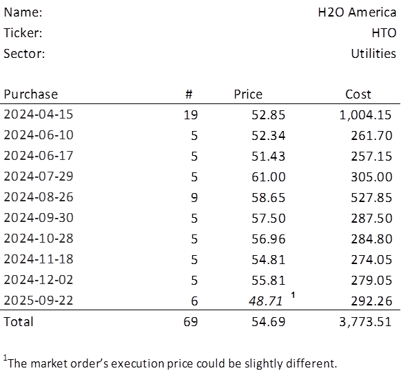 The lowest amount belongs to HTO which last traded at $48.71. Therefore, I will acquire 6 shares on Monday. Below, is the purchase history and average cost calculation.