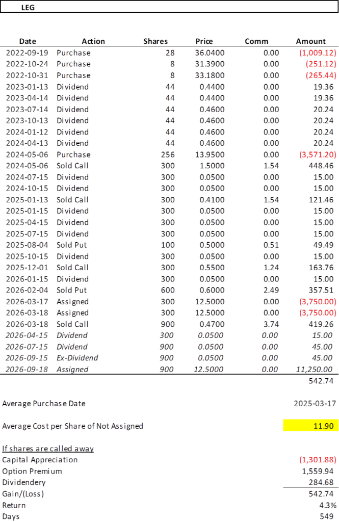 - 2026-02-04: We sold 6 LEG260320P12.5 for $0.60 per share and collected $357.51. LEG reached a daily high of $13.00 and closed at $12.87.